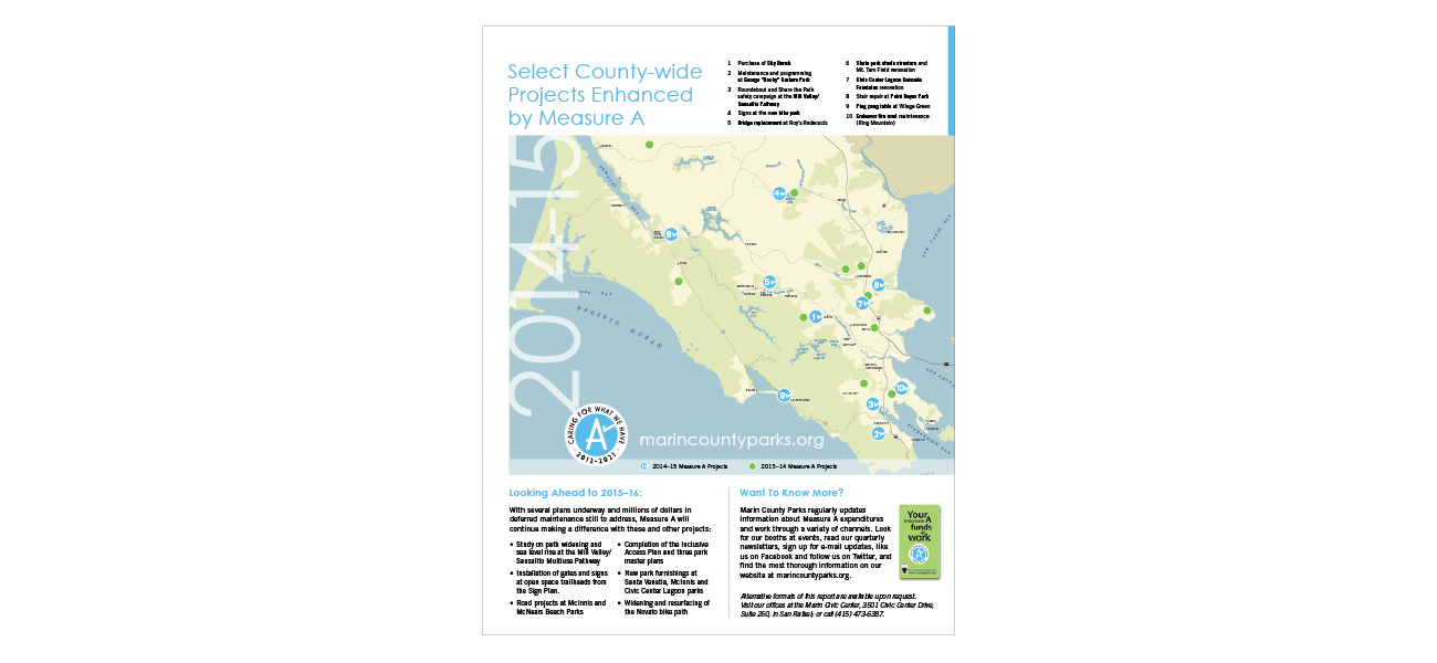 Created a style guide, various print materials and a series of templates (postcards, posters, flyers, project information sheets). Created a tutorial and held InDesign training sessions to allow the organization to create materials in-house. More recently, created the 2014-15 annual report and a set of posters for the Marin County Fair.